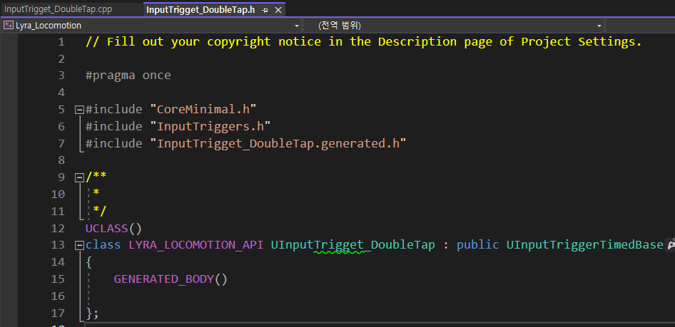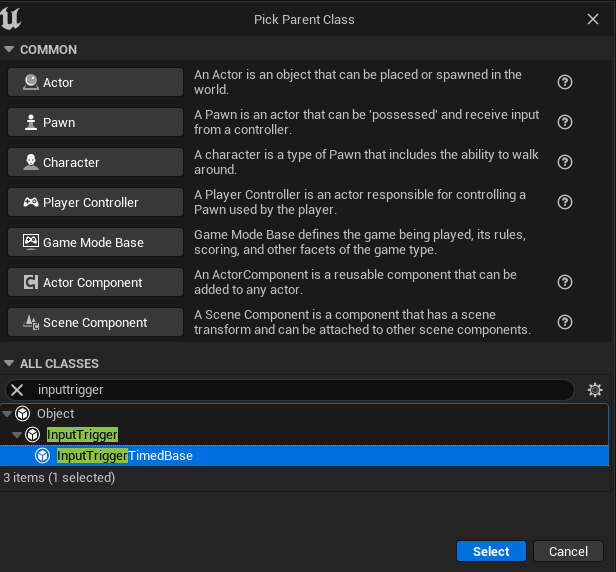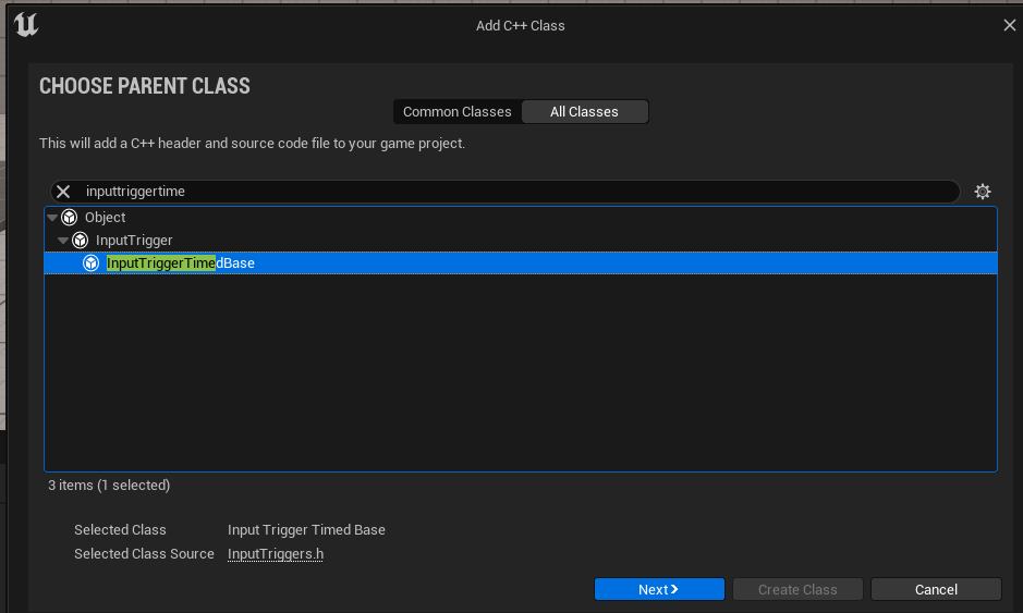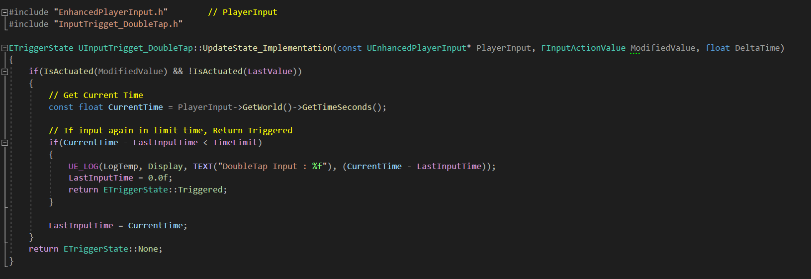 * 이 때 특정 시간안에 다시 해당 키를 눌렀을 때 적용되게 하고 싶으므로, InputTriggerTimedBase를 기반으로 만들었지만, InputTriggerTimedBase의 멤버변수중 float HeldDuration 를 활용하는 것을 보아 홀드 관련에서 쓰기 좋아보여 그냥 InputTrigger로 만드는게 좋아보인다. (그냥 진행하긴 하지만 큰 차이는 없어서 괜찮을 것 같으며 후에 필요시 수정)