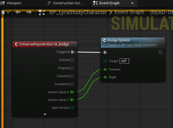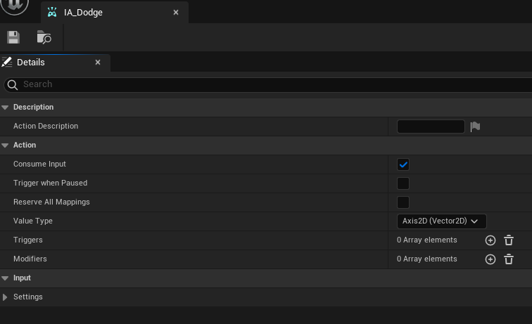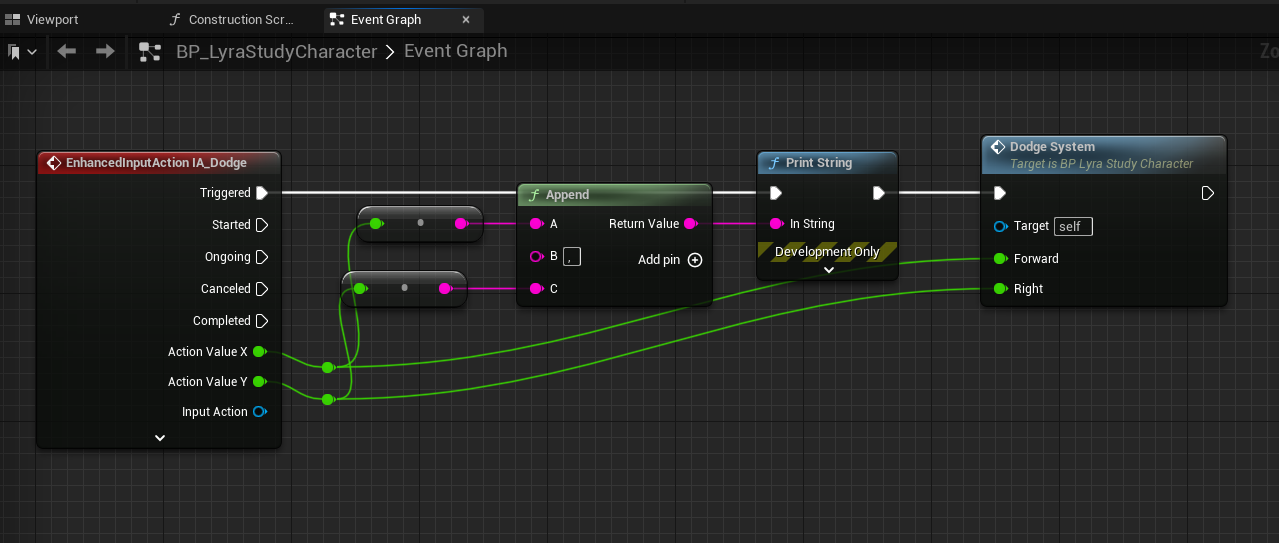 당장에 해결하는 방법으로는 하나하나 키에 대해서는 정상적으로 입력이 되는데, 다른 인풋이 인식되면 그 값이 덮어씌워지는 느낌이라서 IA_Dodge_Fwd / IA_Dodge_Bwd / IA_Dodge_Right / IA_Dodge_Left 와 같이 나눠서 적용하면 될 것 같지만 아직 수정하지는 않았다.