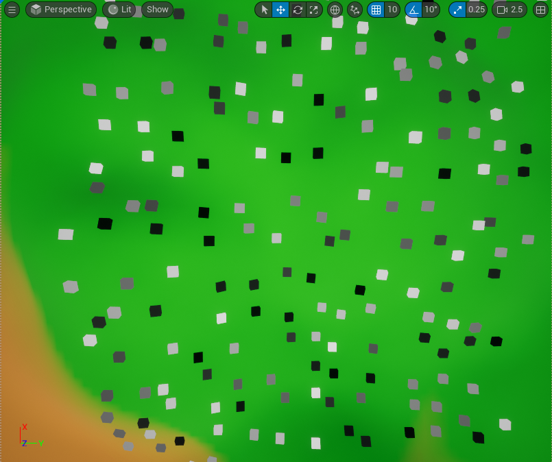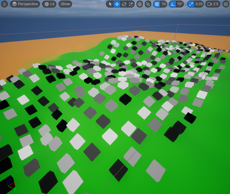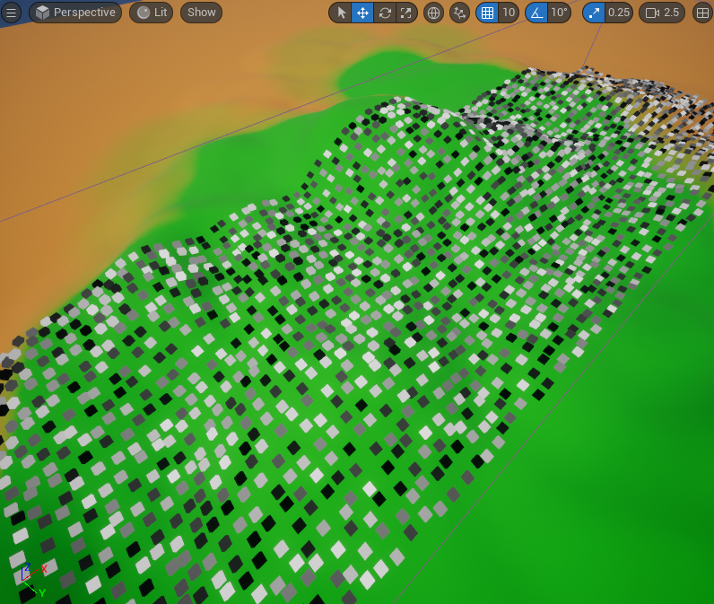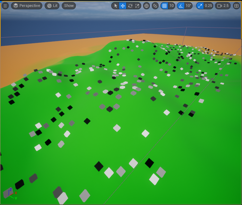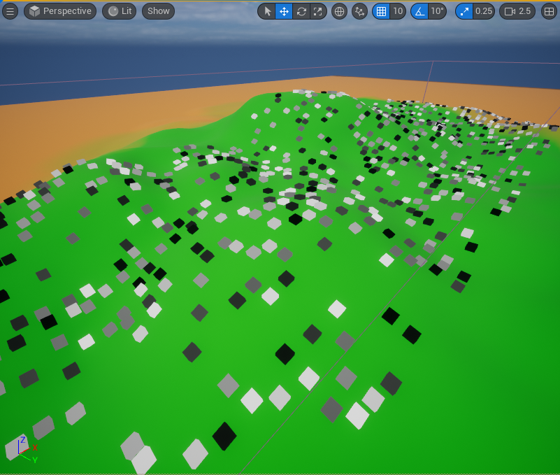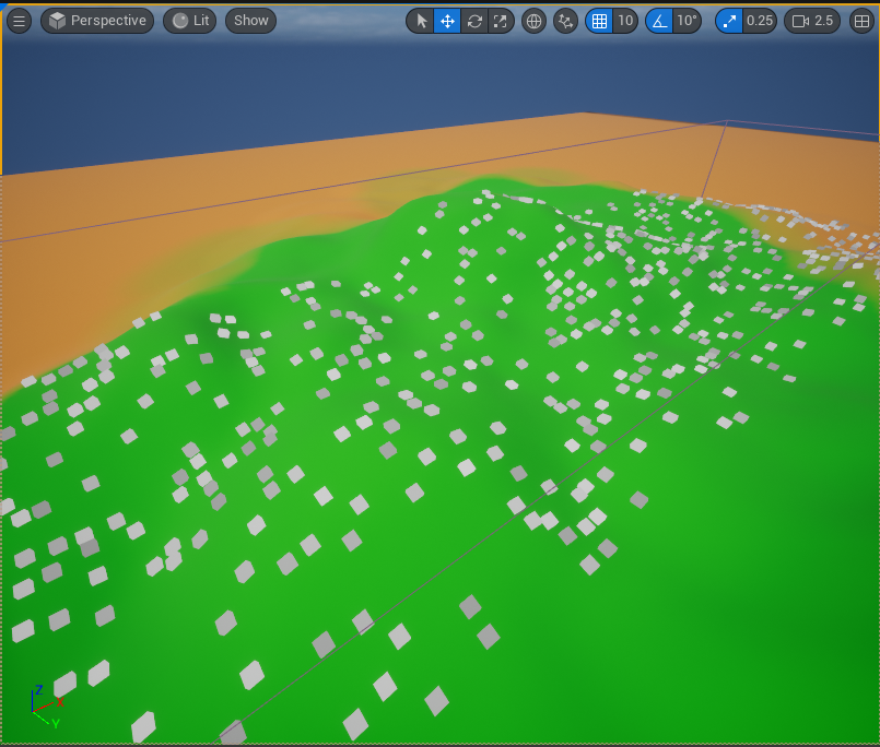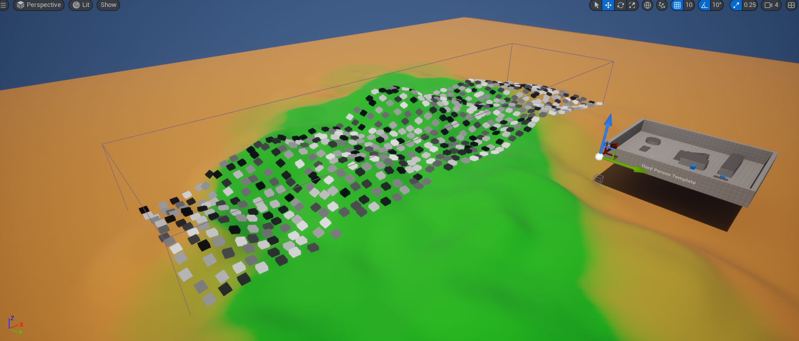 해당 PCG 볼륨이 겹쳐지는 랜드스케이프 범위 내에서 다음과 같이 Point Mesh로 설정된 PCG_Cube가 생성된 것을 볼 수 있다. 또한 랜드스케이프의 굴곡에 맞춰 배치된 것도 확인할 수 있다.