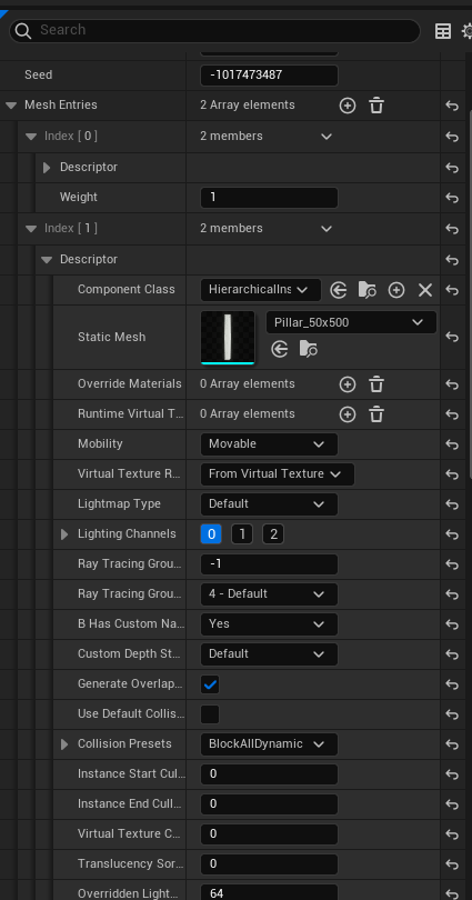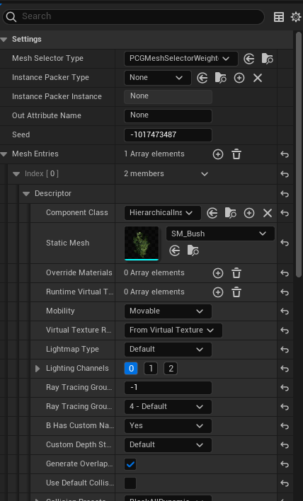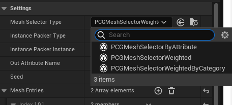 Mesh Selector Type의 옵션에서 직접 빌드함으로써 원하는 옵션으로 선택하거나, 현재 디폴트로 되어있는 PCGMeshSelectorWeighted를 활용한다면,