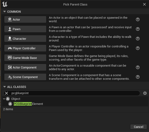 Blueprint를 만들 때 PCGBlueprintElement를 상속받아 만들 수 있고,