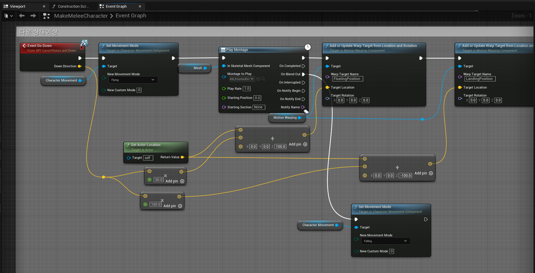 또한 MotionWarping에서 Z축의 이동을 가할 때 플레이어 캐릭터의 Character Movement Mode가 Flying이 아니면 적용되지 않는 현상이 있어, 해당 모드를 변경해주는 것도 추가되어있다.