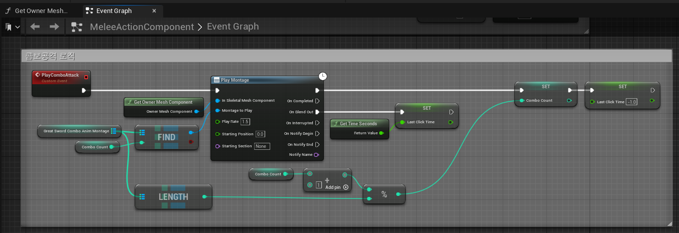 1. Play Montage를 통해 해당 컴퍼넌트를 가진 캐릭터 메쉬에게 현재 콤보 단계에 맞는 AnimMontage를 재생시킨다.