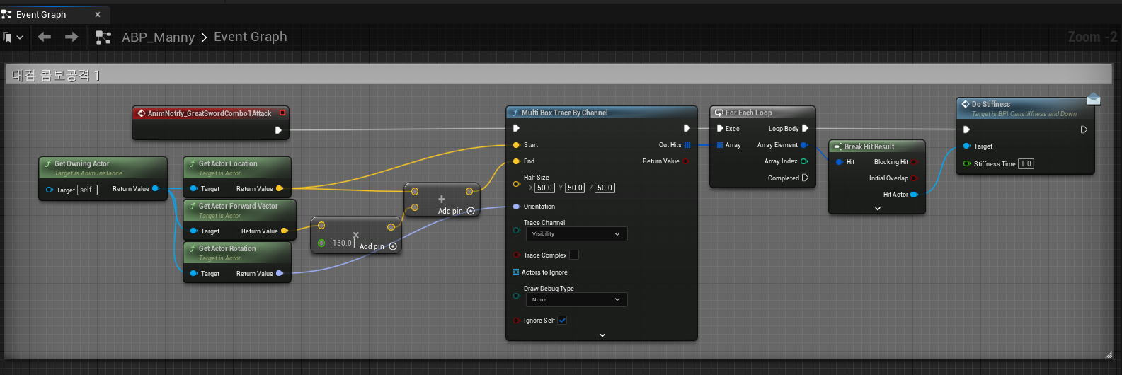 또한 이미지 내에 보이는 Do Stiffness는 경직을 주는 Blueprint Interface로, 3타에는 해당 부분에 다운 상태이상을 주도록 하는 함수를 사용했다.