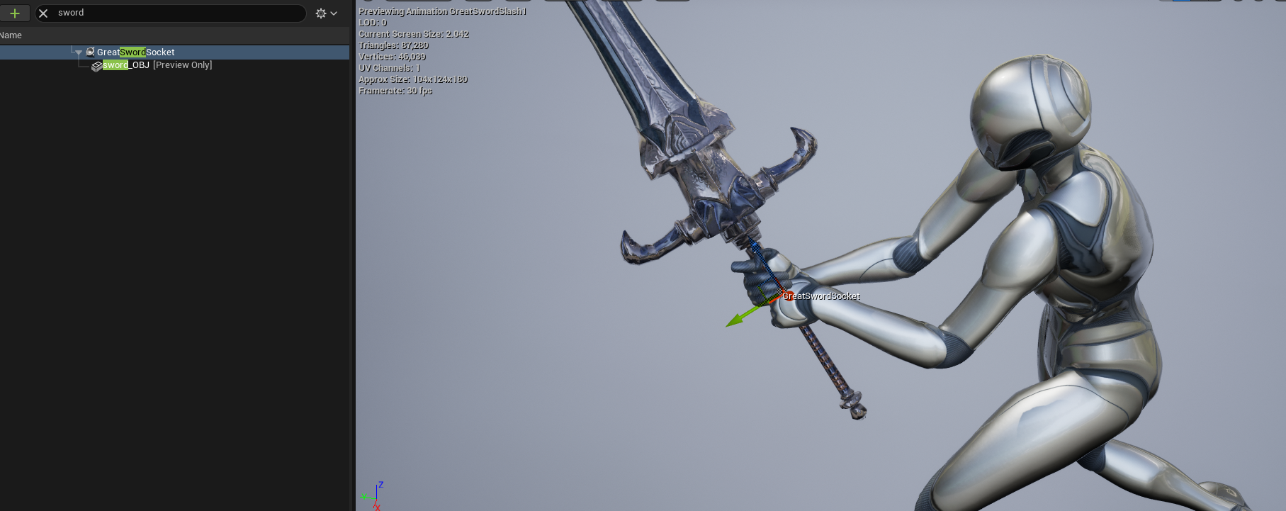 먼저 캐릭터에게 사용한 대검 에셋은 Sketchfab.com 에서 다운받았고 다음과 같은 과정을 통해 장착시켰고,